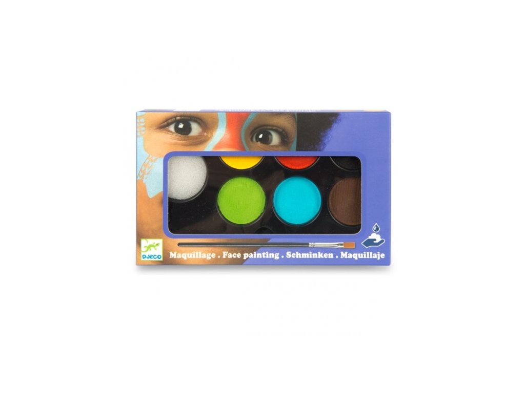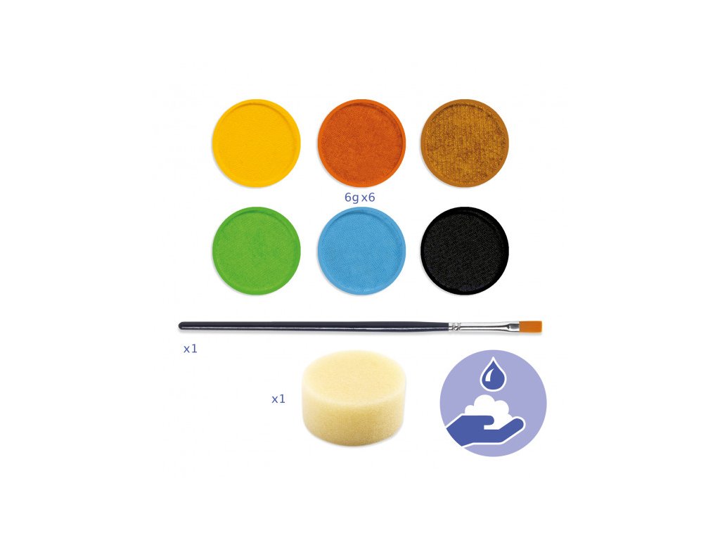 Obsahuje: 6 barev(6 x 6g): hnědá, oranžová, žlutá, světle zelená, azurová, černá, 1 plochý štětec a 1 houbička