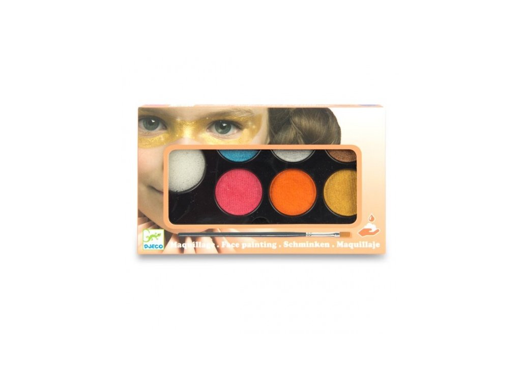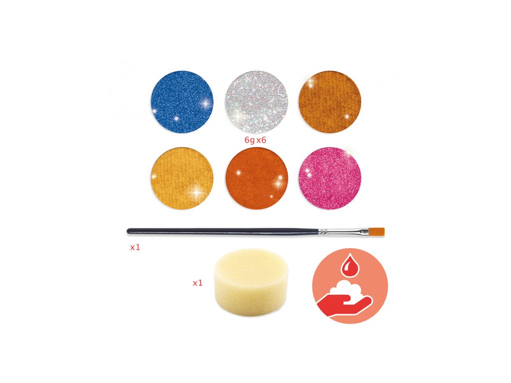 Obsah: 6 barev (6 x 6g): perleťově oranžová, starozlatá, zlatá, stříbrná, perleťově modrá, perleťově růžová, 1 plochý štětec a 1 houbička