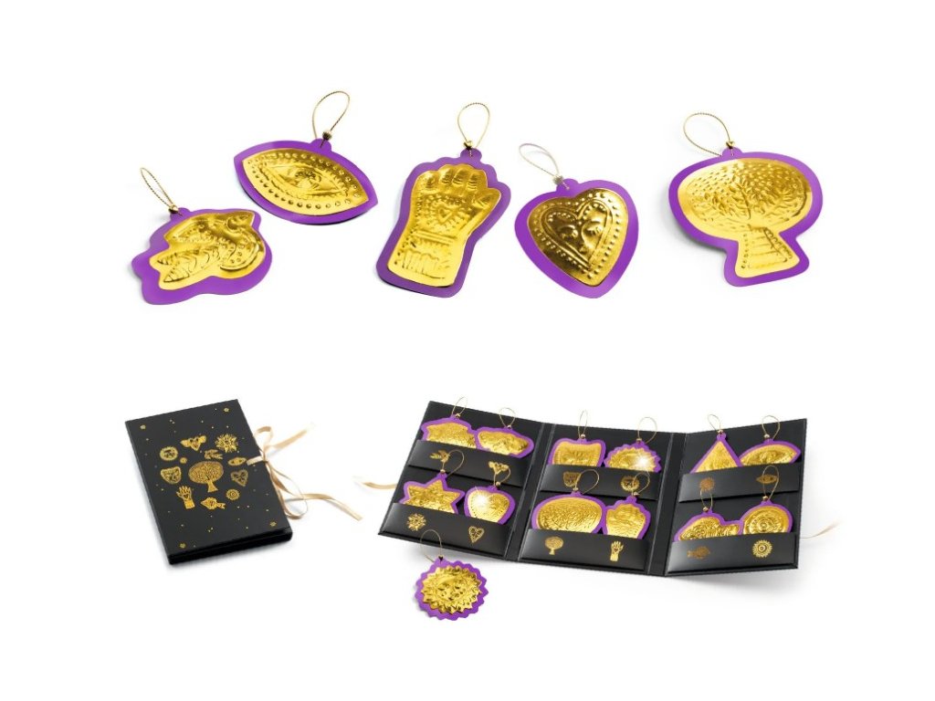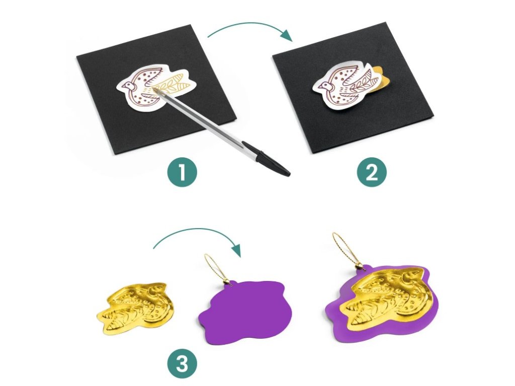 Embosování je způsob dekorování, při kterém vzniká vystouplý motiv na povrchu materiálu. Děti položí kovový tvar na pěnovou desku, překryjí jej šablonou a jednoduchým přejížděním nástrojem vytvoří reliéfní ilustraci. Hotové talismany si mohou ozdobit korálky, navléknout na zlatou nit a uložit do praktické úložné kapsy.