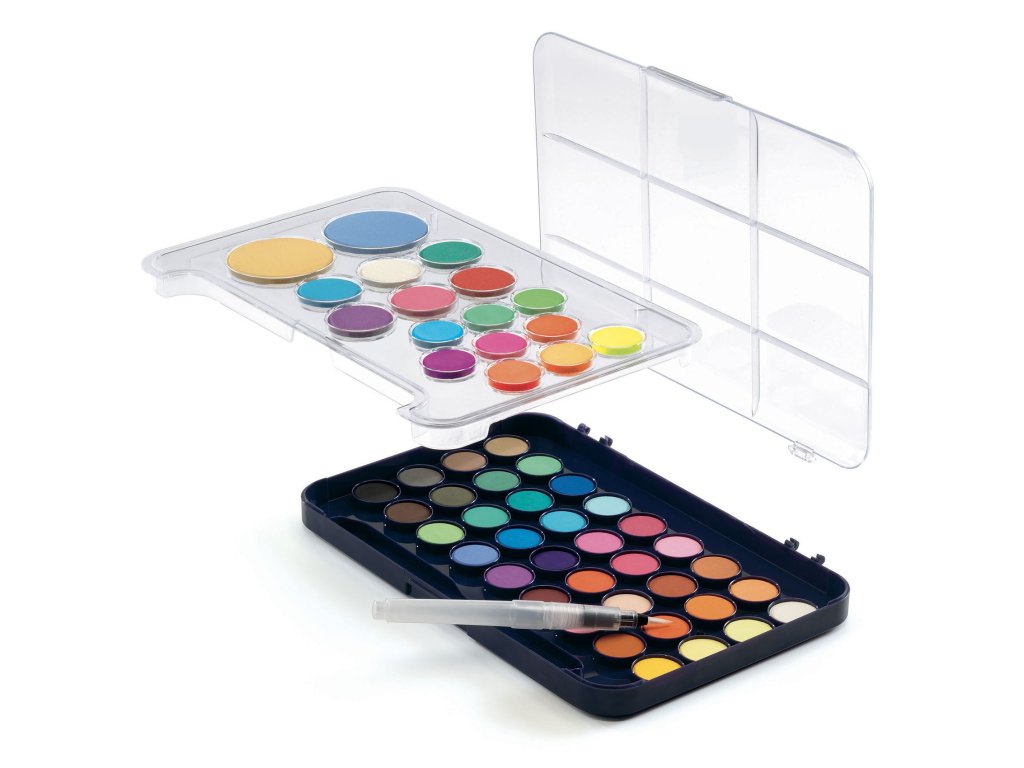 Obsah: 53 vodových barev - 36 klasických barev, 9 fluorescenčních barev, 8 perleťových barev, 1 štětec se zásobníkem vody