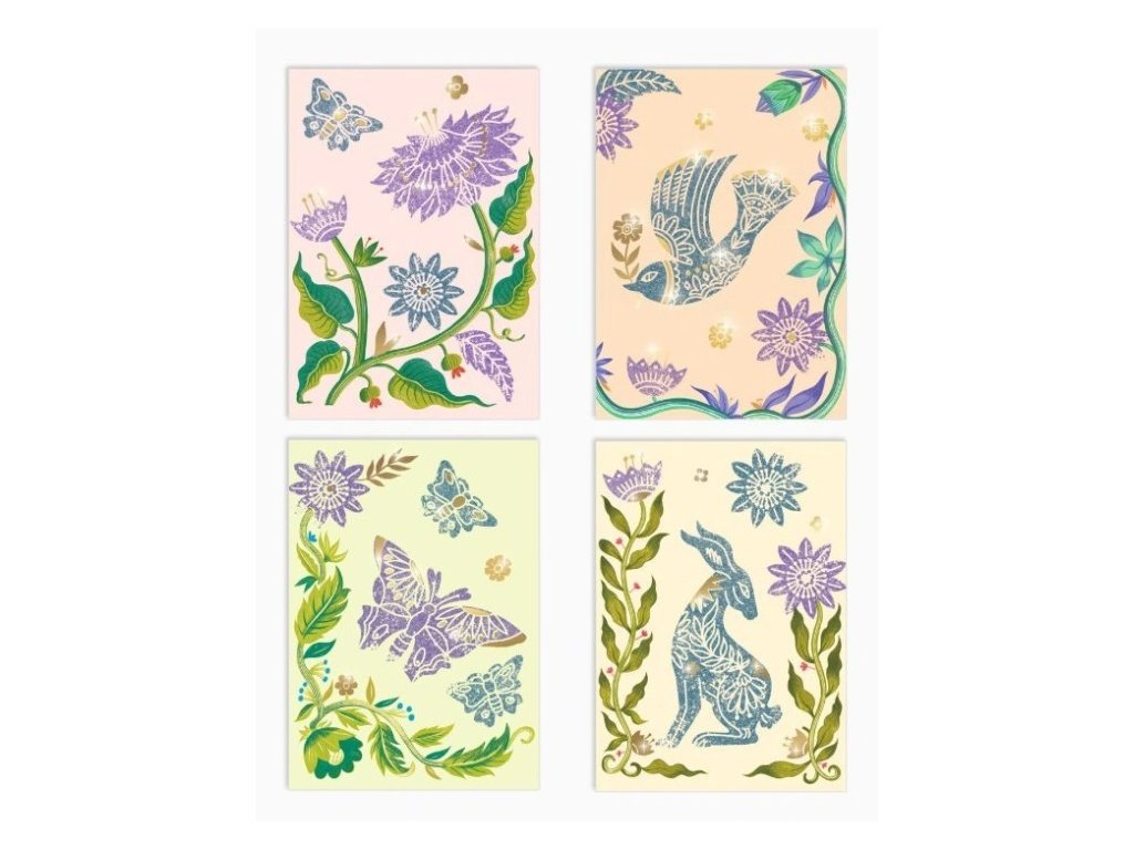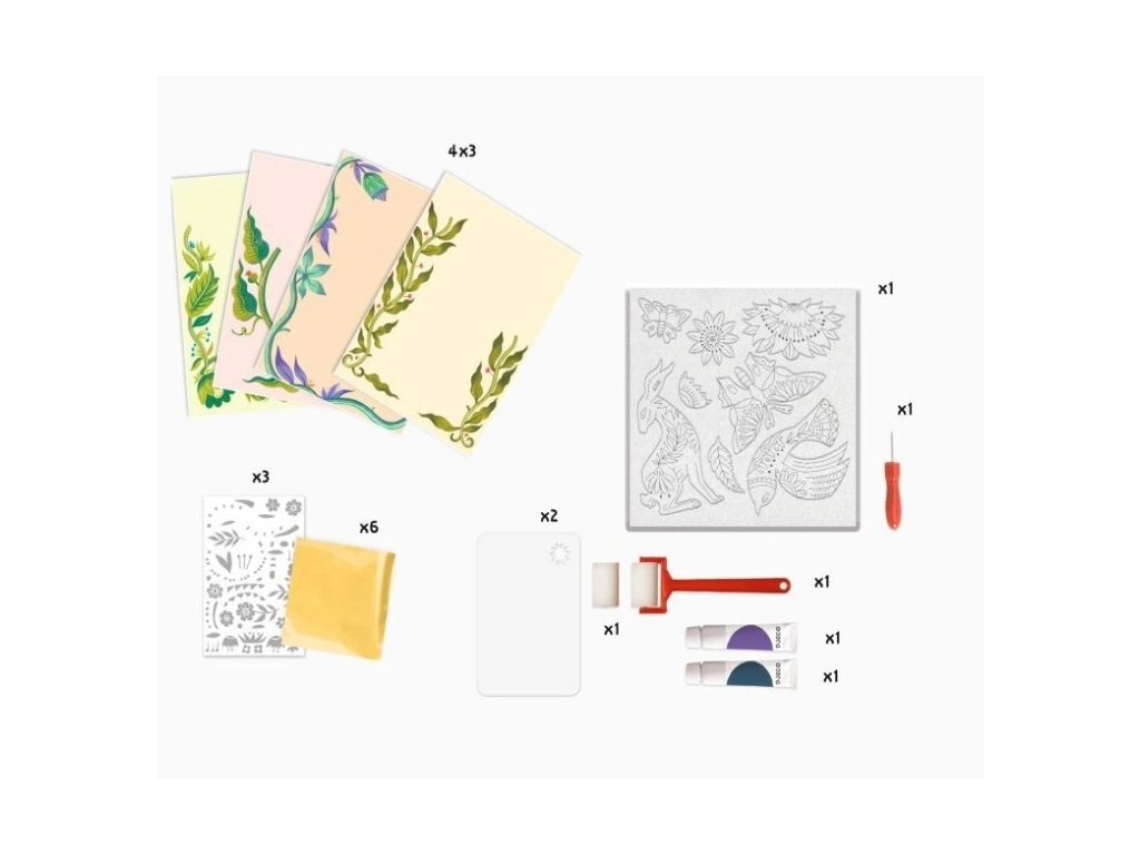 Pomocí kvašových barev a pěnových válečků si děti vytisknou až 12 jedinečných kartiček, které lze na závěr ozdobit metalickými fóliemi. Ty dodají hotovým výtvorům luxusní, třpytivý vzhled a udělají z každé kartičky malé umělecké dílo.