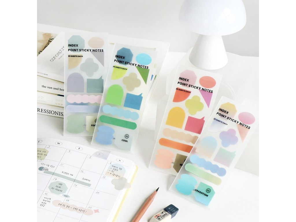 Samolepící bločky Index Point Sticky Notes. V různých tvarech - každý má 20 samolepicích lístků.