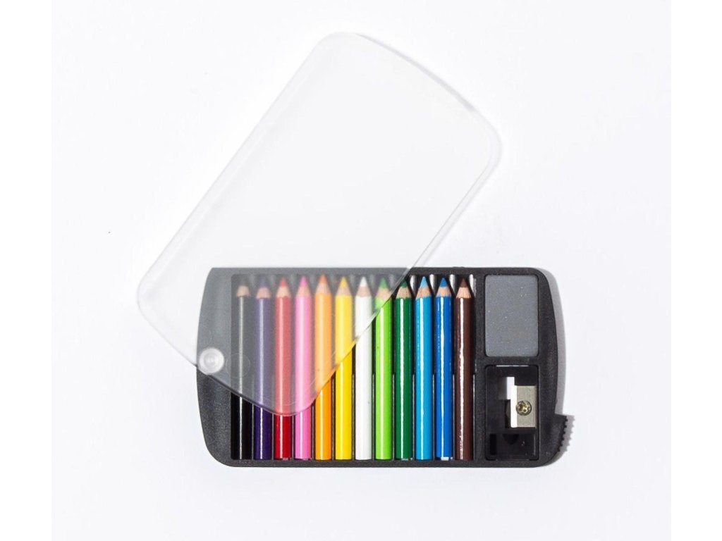Set pastelek na cesty, který můžete mít vždy u sebe. I přes rozměry kreditní karty obsahuje 12 pastelek, gumu a ořezávátko. Rozměry 93 x 53 x 5 mm. Vyrobeno v Japonsku.