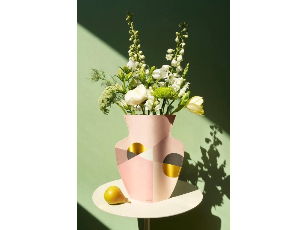 2. Otevřete papírovou vázu jemným zatlačením na okraje a nasaďte ji na nádobu. Váza je vyrobena z nepromokavého papíru. Pokud papír navlhne, nechte ho jednoduše uschnout. Naaranžujte květiny a rozjasněte si své oblíbené místo.