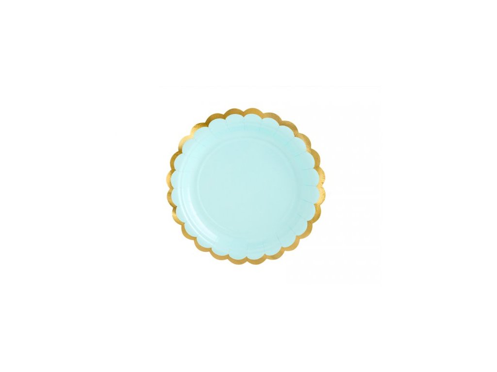 Papírové talířky v mátové barvě se zlatými okraji. Průměr talíře je cca 18cm, balení obsahuje 6ksDoplňkové parametry