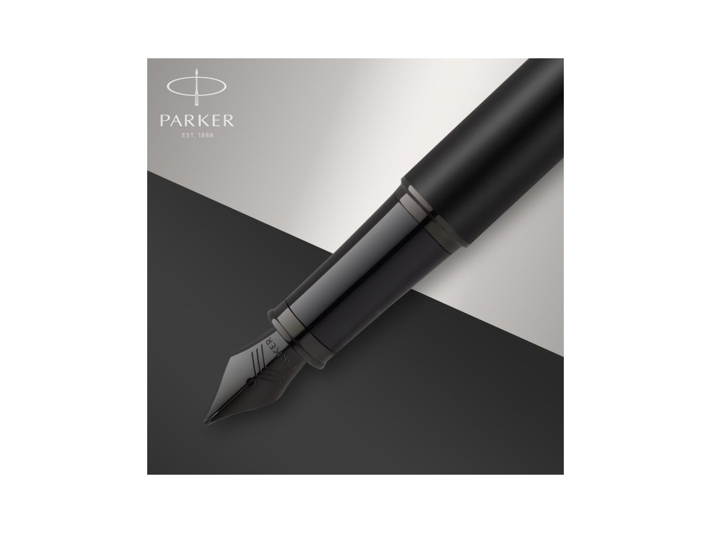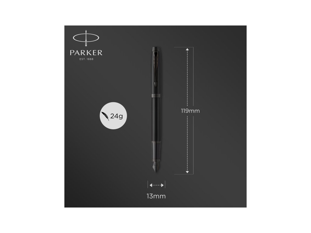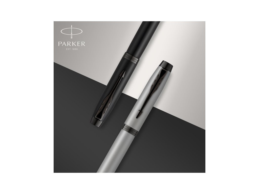 Parker IM Achromatic je partner s neomezenými možnostmi. Díky módnímu monochromatickému provedení a modernímu matnému designu je ideálním doplňkem pro mladou generaci. Je elegantní i vysoce profesionální a spolehlivý. Tělo a víčko pokryté černým lakem, potažené pomocí techniky PVD odolnou matně černou vrstvou. Hrot z nerezové oceli potažený odolnou matně černou vrstvou. Dvoukanálkový systém zásobování hrotu inkoustem. Nasazovací víčko. Dodáváno s modrou bombičkou. Baleno v dárkové krabičce.