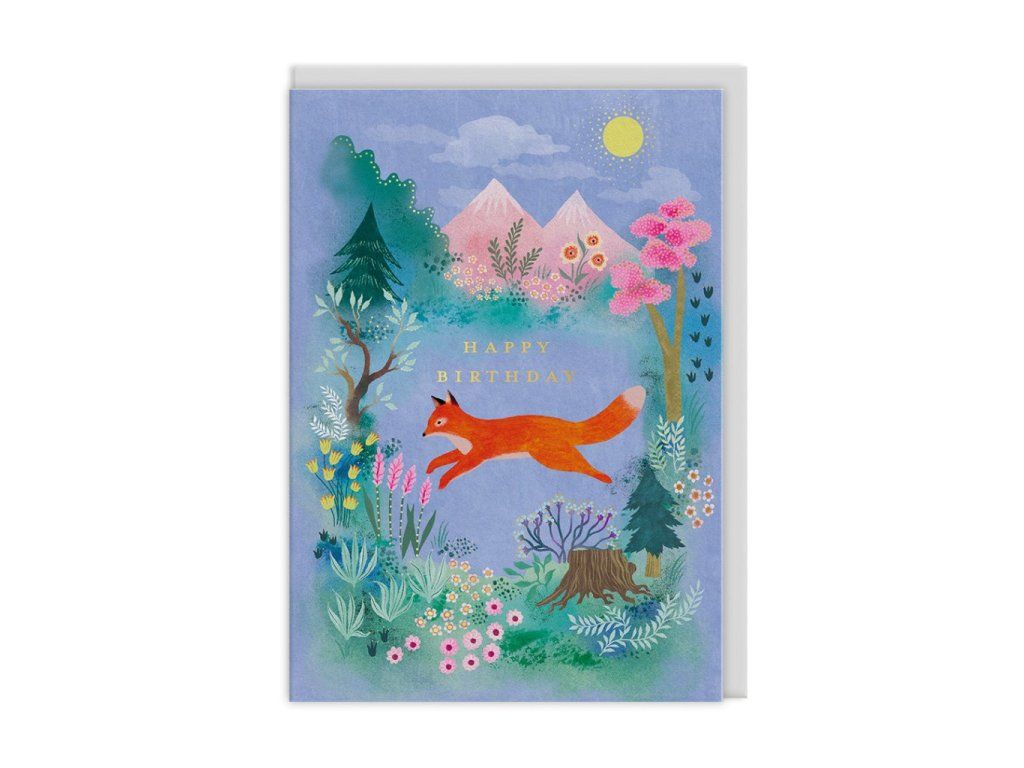 Liška se prohání mezi pastelově růžovými horami, kvetoucími keři a štíhlými stromy — a nad celou scénou se vyjímá zlatý nápis HAPPY BIRTHDAY. Přání Mountain Fox od britské značky Ohh Deer navrhla francouzská ilustrátorka Cécile Metzger — a každý drobný kvítek či větvička stojí za to, aby se u nich obdarovaný na chvíli zastavil.