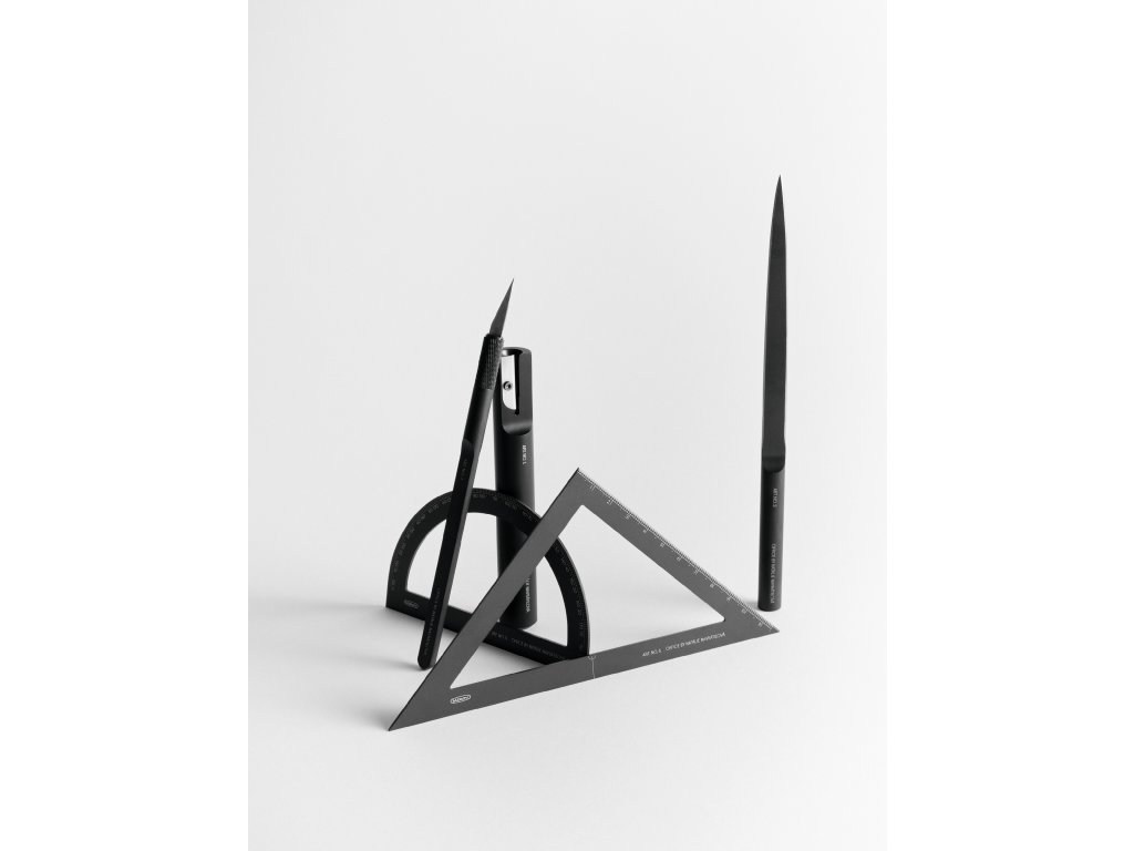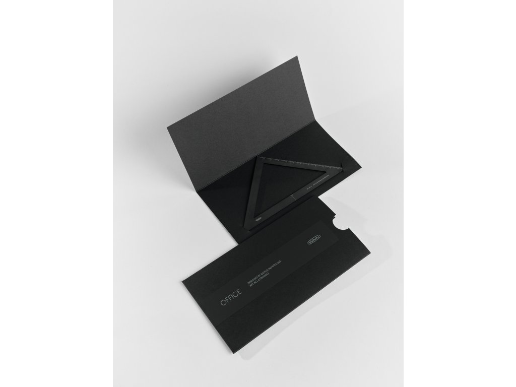 Pravítko trojúhelník je šestým produktem kolekce Office. Na první pohled je subtilní, avšak zároveň díky tomu, že je vyrobeno z nerezové oceli, je neobyčejně pevné. Designově zajímavá povrchová úprava pravítka trojúhelník je DLC, která se svou tvrdostí a odolností rovná diamantu. Pro své výjimečné vlastnosti je používána pro nástroje pracující v těch nejnáročnějších podmínkách.