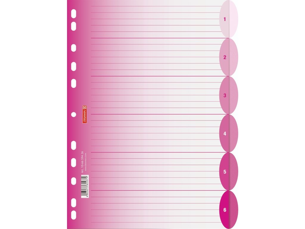 Rozlišovač do šanonu nebo do kroužkových pořadačů má formát A4 a celkem 6 oddílů. Na vnější straně pořadače sou číslovky. Na celé ploše ještě najdeme dostatečné množství linek pro napsání obsahu - tedy toho, co je uvnitř skryto. - Perforace rozlišovacích listů - Rozdělovač do pořadače - Rozdružovací papírové listy A4 - Kancelářské potřebyDoplňkové parametry