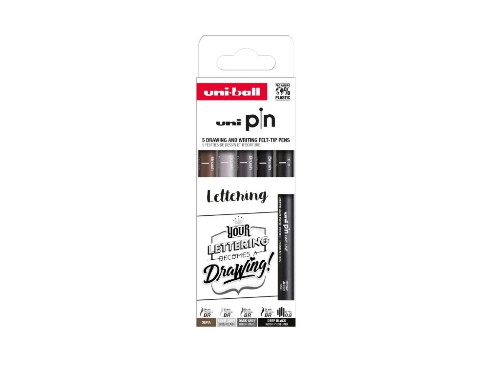 Sada Lettering obsahuje 4 linery se štětcovým hrotem a liner s kalibrovaným hrotem o průměru 0,8 mm. Sada je vhodná pro moderní kaligrafii a lettering.