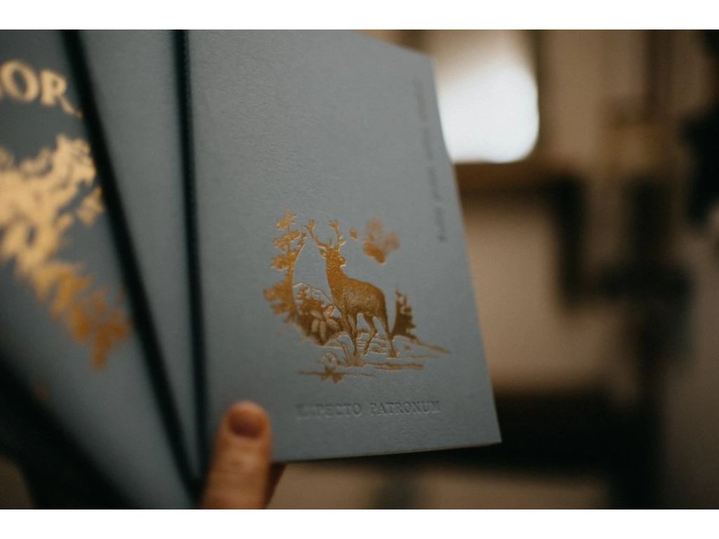 - tisk přes zlatou fólii (zlatotisk) na titulní straně v designu Jelena (patron Harryho Pottra)