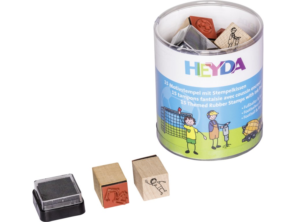 Sada razítek se skládá z 15 motivů. Děti si mohou natisknout obrázky s motivem fotbalista, míč, fotbalová branka, ale i bagr, buldozer, auto s betonem a práce na stavbě.. - Velikost otisku cca 16mm - 1 černý razítkovací polštářek - Rychleschnoucí inkoust - V transparentním boxu o průměru 7,5x9cm - Dřevěné razítko Heyda - Dřevěná razítka pro děti - Sada razítek pro kluky - Potřeby pro děti do školy - Cardmaking, scrapbookingDoplňkové parametry