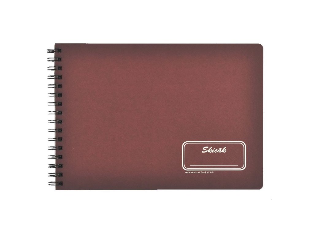 Vrchní obálka skicáku je ve fialové retro barvě z lepenky a je osazena designovým štítkem s logem.