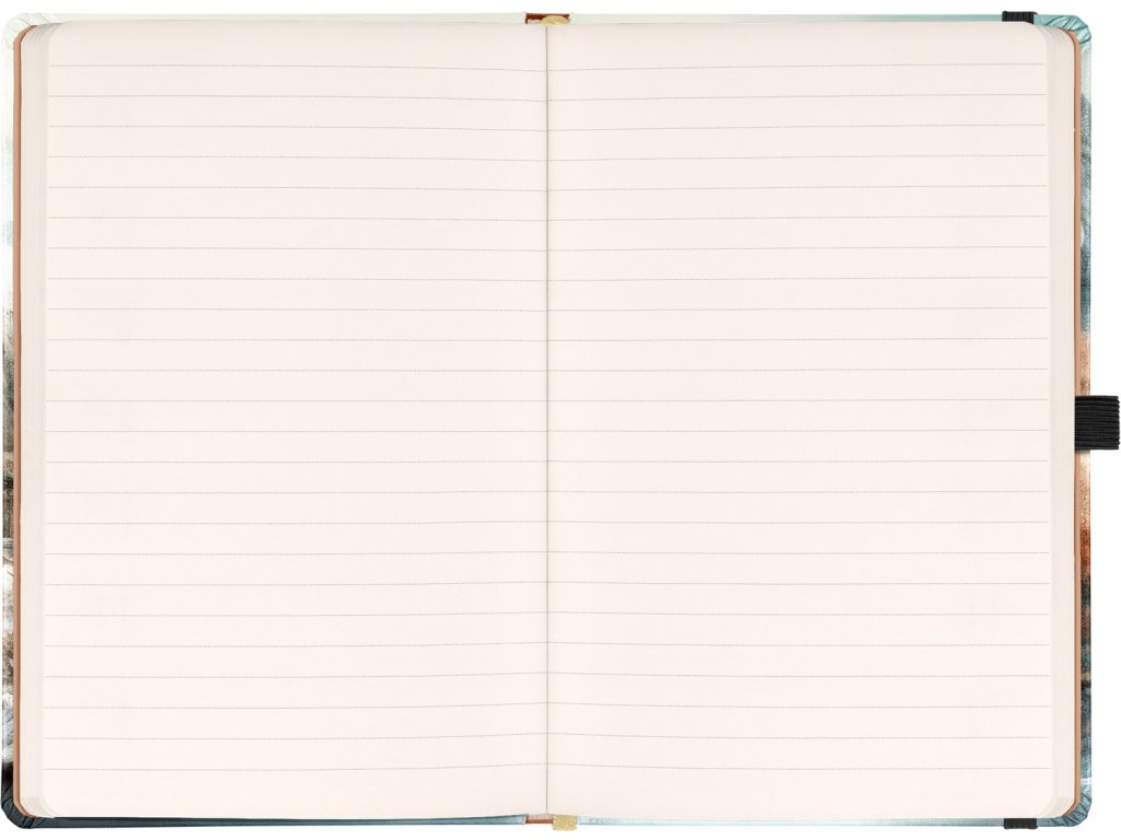 Existují myšlenky, které s námi cestují časem, nápady, které k nám promlouvají prostřednictvím symbolů. Zápisník v barvě středomořské modré, linkované listy.